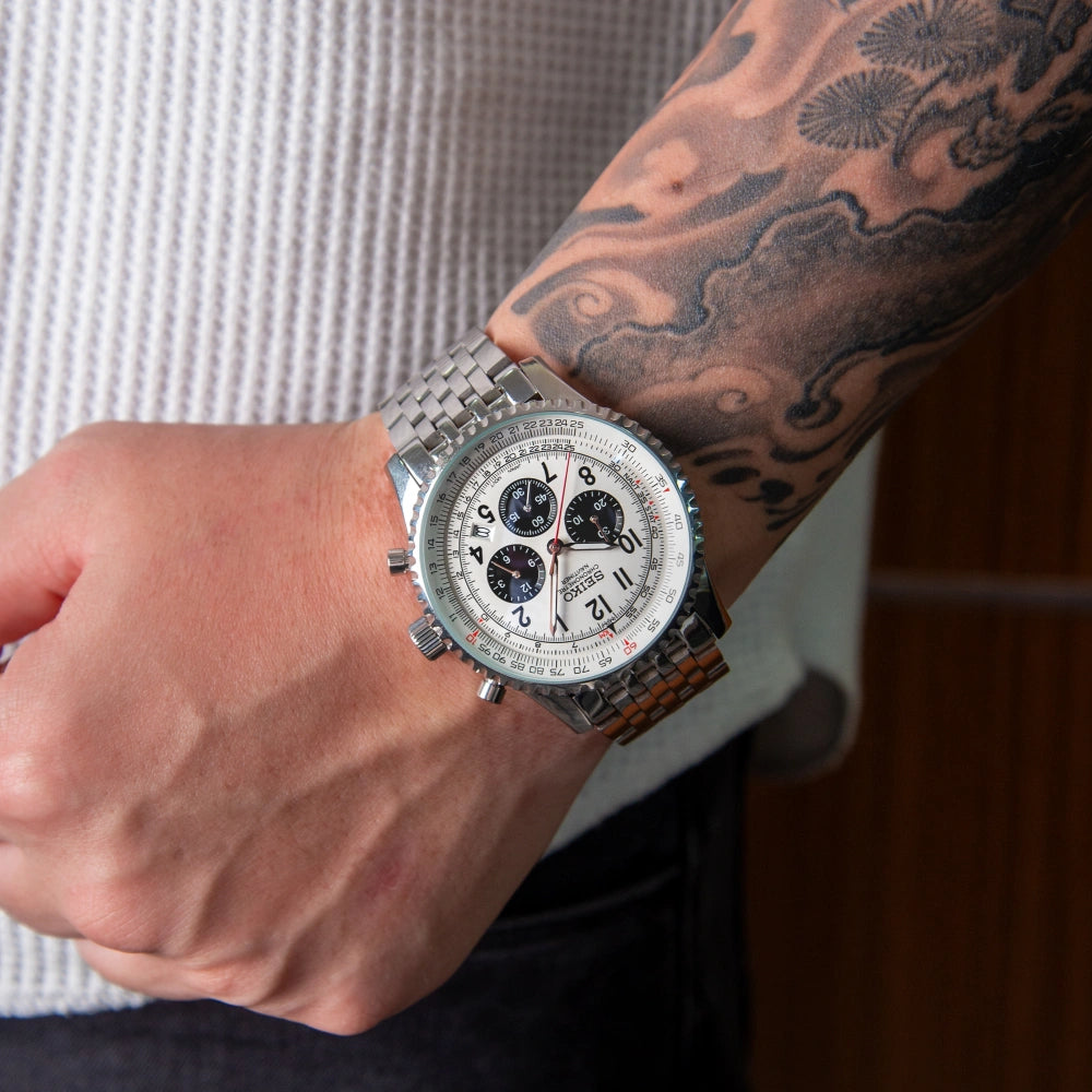 En el corazón de este reloj se encuentra la fusión de dos mundos: la elegancia atemporal del diseño Daytona, ahora fusionada con la precisión robusta de un movimiento Seiko. Elaborado meticulosamente por artesanos expertos y entusiastas por igual, cada Seiko-Mod Daytona encarna la esencia de la innovación y la dedicación.